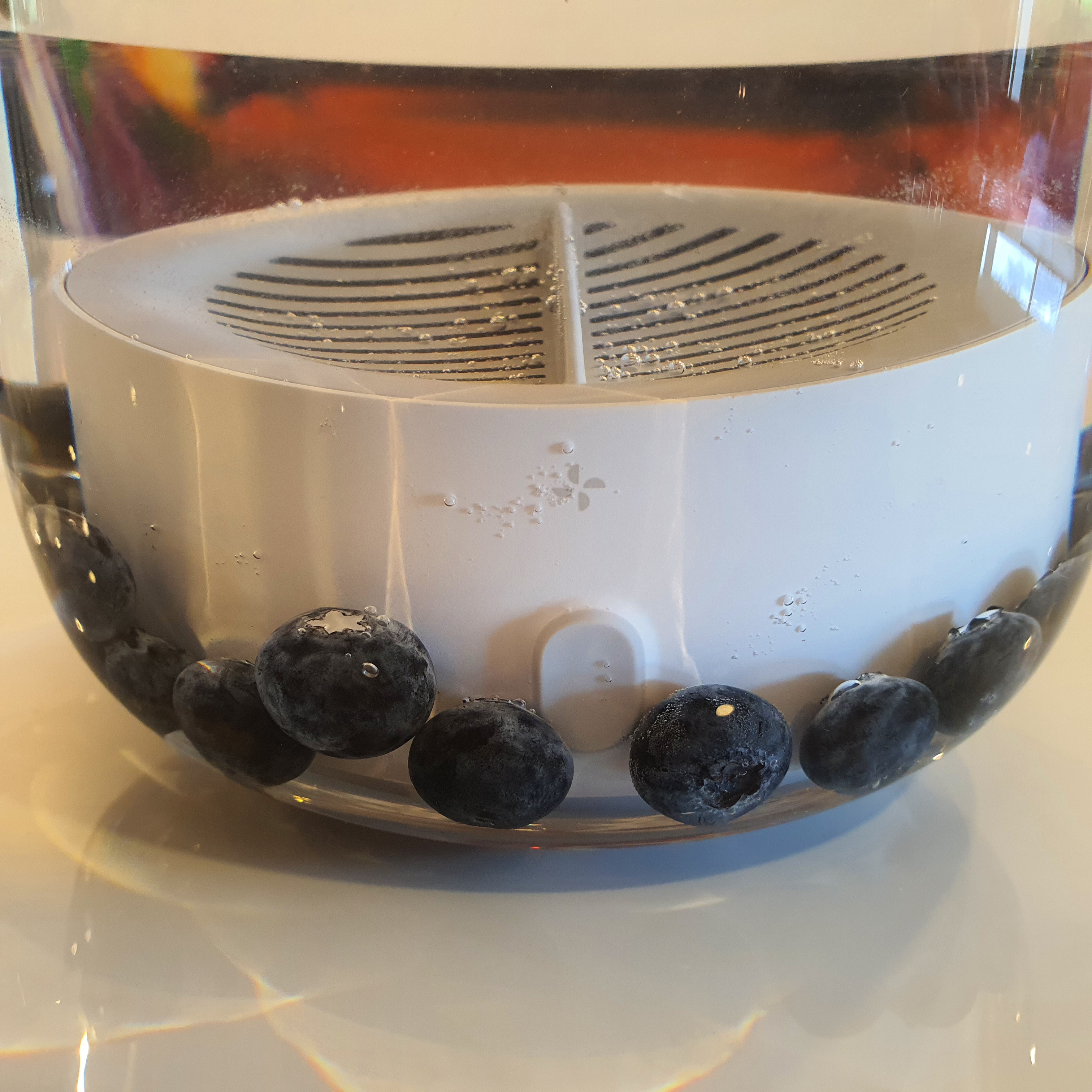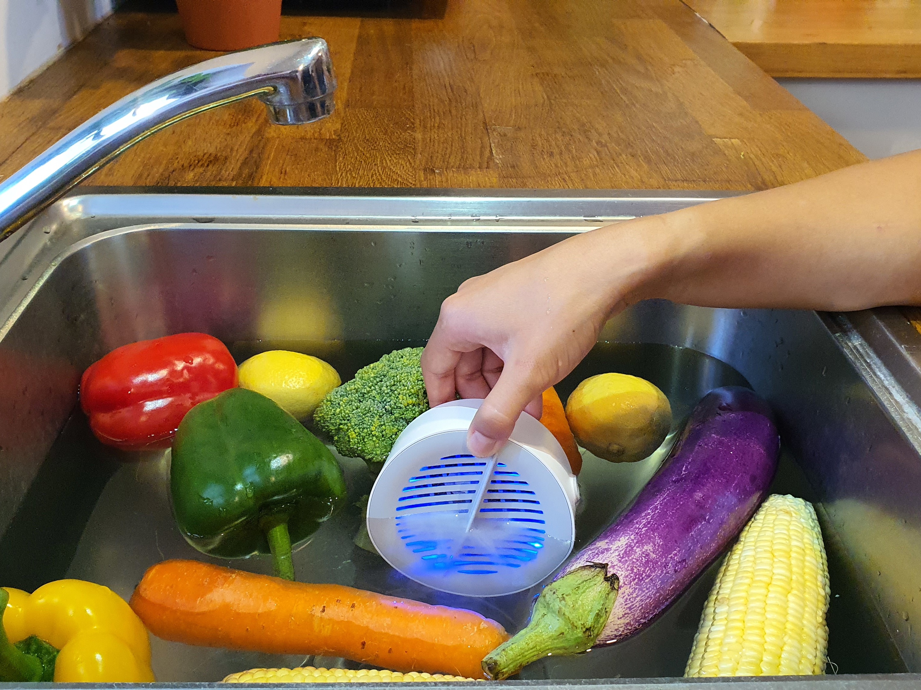 Step 3: Your AquaPure will flash blue as it electrolyzes your water and cleans your produce. After a few minutes it stops flashing — that means it's done!